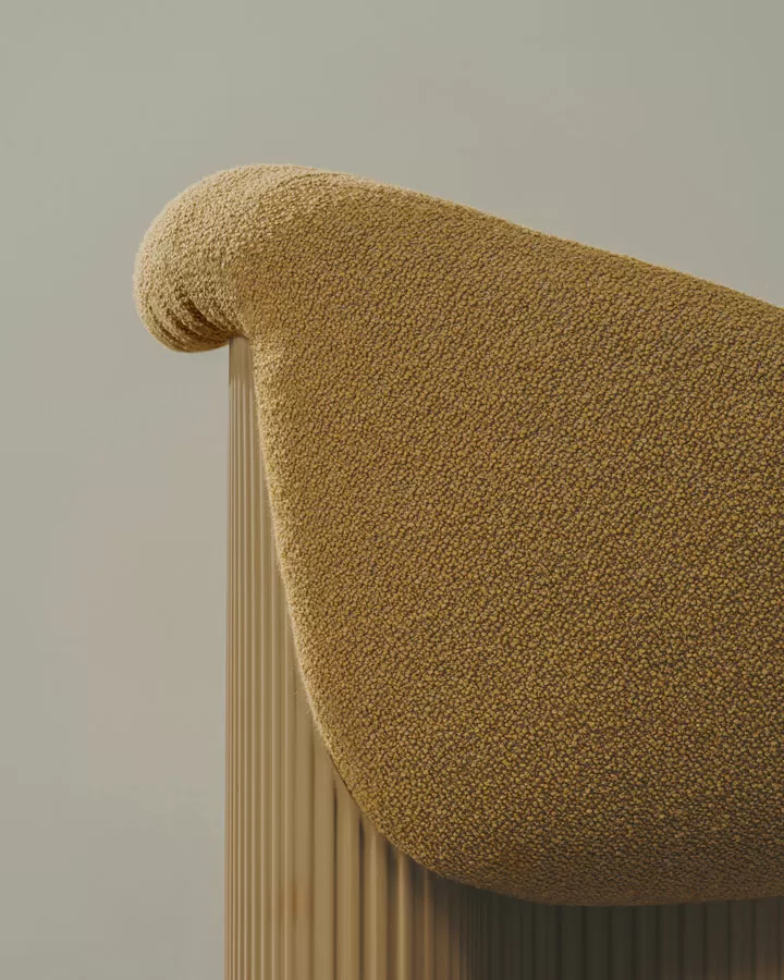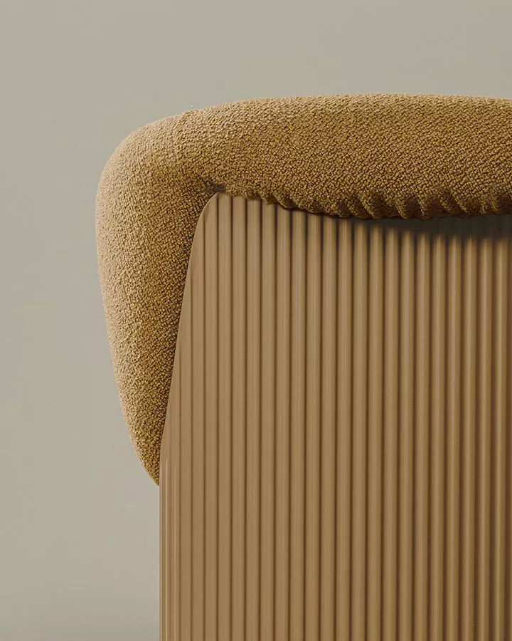 Иконичное центральное основание отличается органичной формой и рифленой текстурой поверхности, которая придает объекту характер. Основание выполнено из термополимера Pure ECO®, доступно в 10 цветах и изготовлено из 100% переработанного материала, который также подлежит повторной переработке. Комбинация технических пен различной плотности во внутренней структуре кресла обеспечивает мягкость и поддержку. Обивка выполнена по современному «чехольному» принципу: текстиль точно повторяет геометрию сиденья и спинки. Кресло может быть выполнено в любом варианте обивки из коллекции Andreu World.