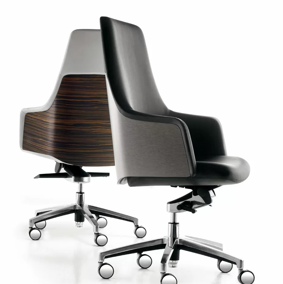 Кресло для руководителя имеет пятилучевую алюминиевую базу и регулируется по высоте. Синхро-механизм обеспечивает уровень комфорта, необходимый для продуктивной работы в течение всего дня. Сочетание текстур деревянной спинки с отделкой из орехового дерева, мягкой обивки, алюминия привносят элегантность и стиль. Кресло для посетителей может быть выполнено с тремя вариантами базы: 4-лучевая хромированная база с колесиками и без, а также 5-лучевое основание с регулировкой высоты. Механизм автоматического возврата у кресла для посетителей делает его невероятно удобным.