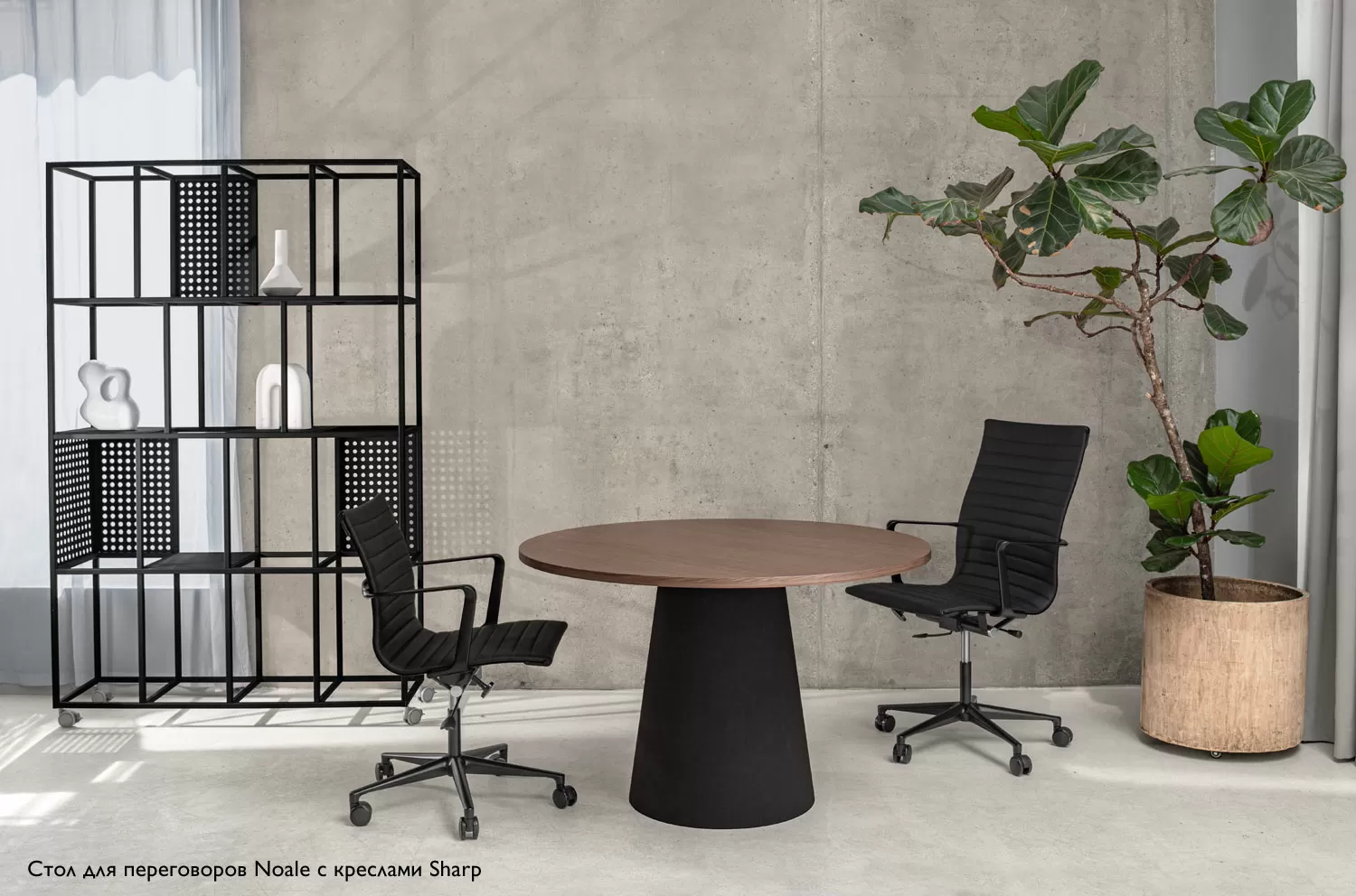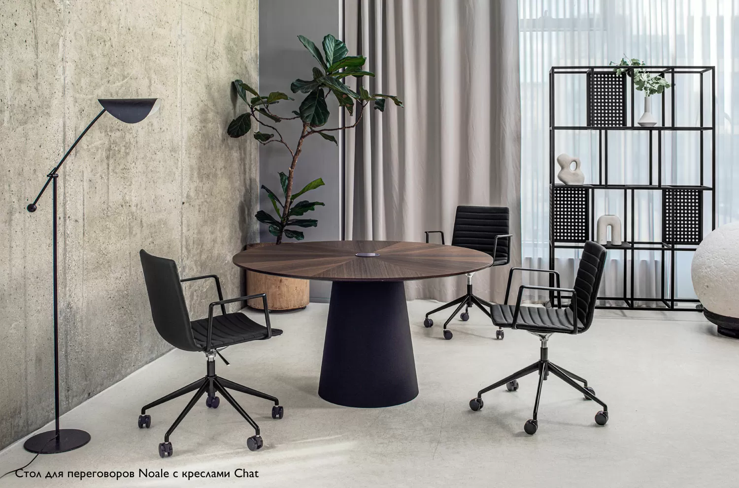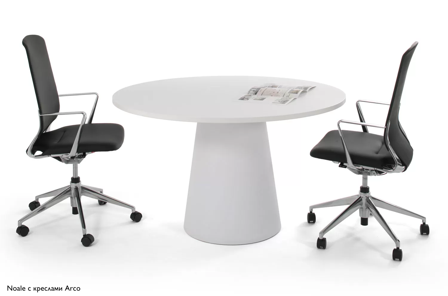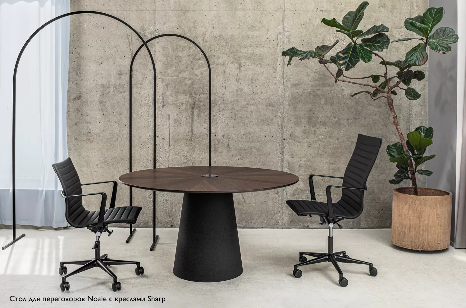 Стол для переговоров Ноале создает атмосферу открытого диалога и равноправного общения. Круглая столешница доступна в двух диаметрах и двух вариантах отделки — шпон или меламин. Выразительные конусообразные опоры с порошковым покрытием становятся элегантным акцентом интерьера. Универсальное решение для переговорных разных площадей сочетает продуманный дизайн с практической функциональностью, создавая комфортную рабочую среду.