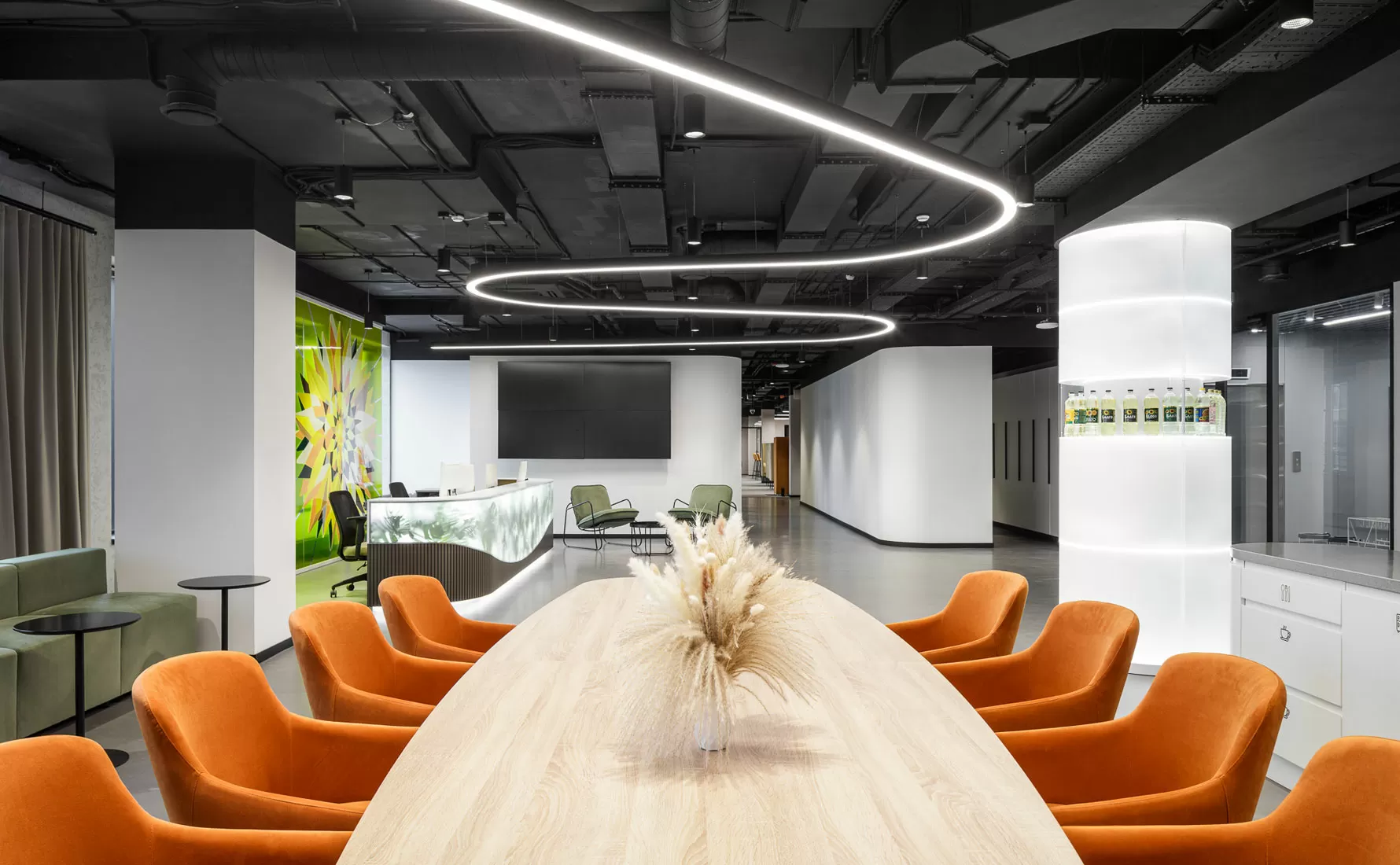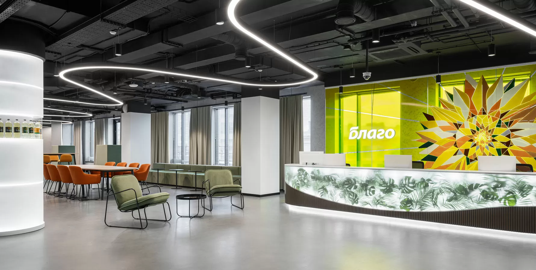 Также в офисе повсюду повторяется волнообразная форма — в потолке, панелях, светильниках и даже стойке ресепшн. Она мягко напоминает о полях и природе. Главный акцент — витраж с подсолнухом у входа и светящийся логотип компании.