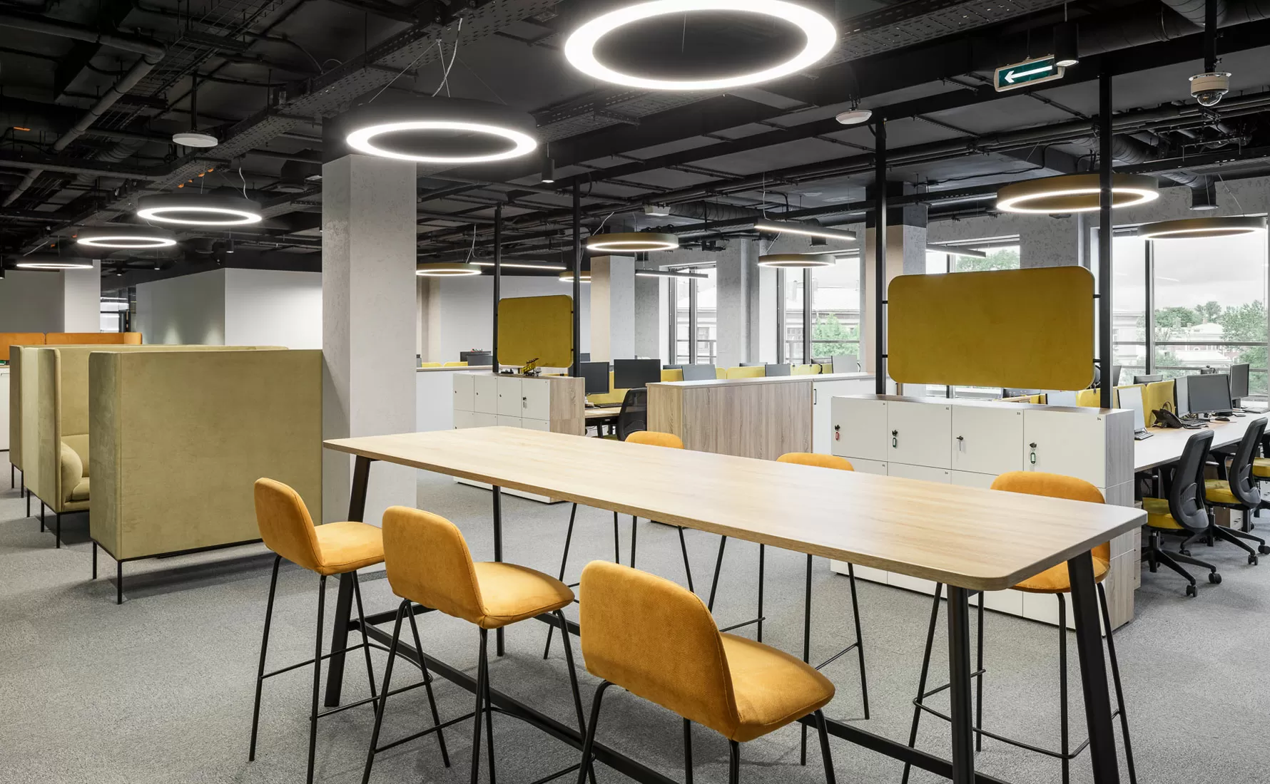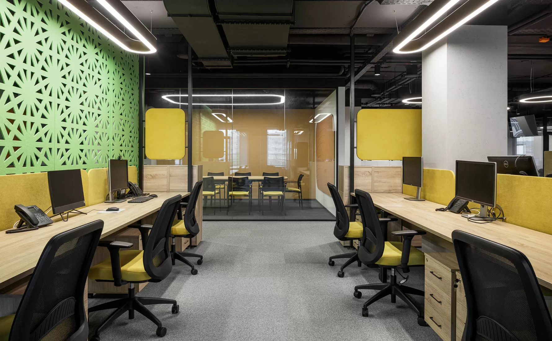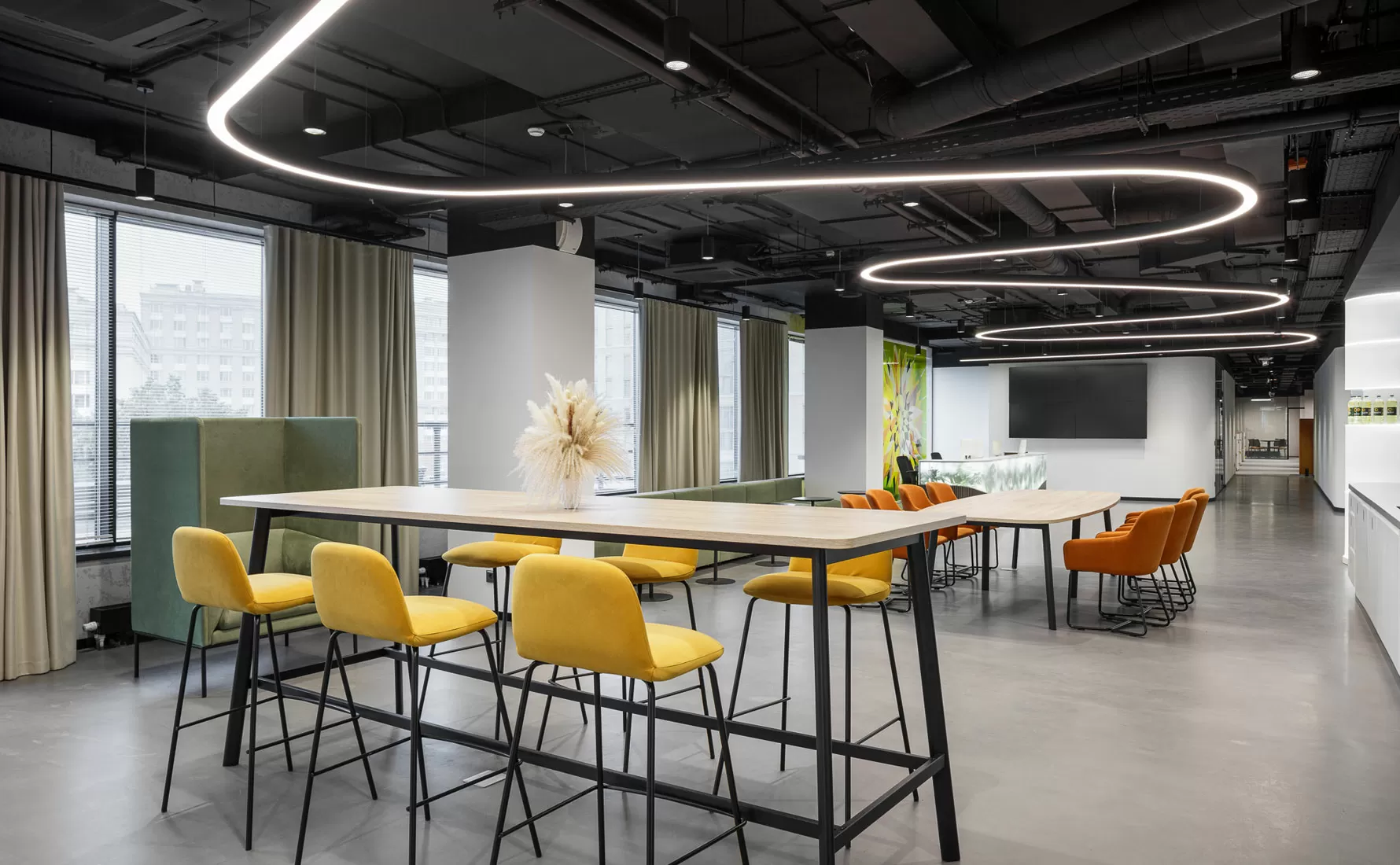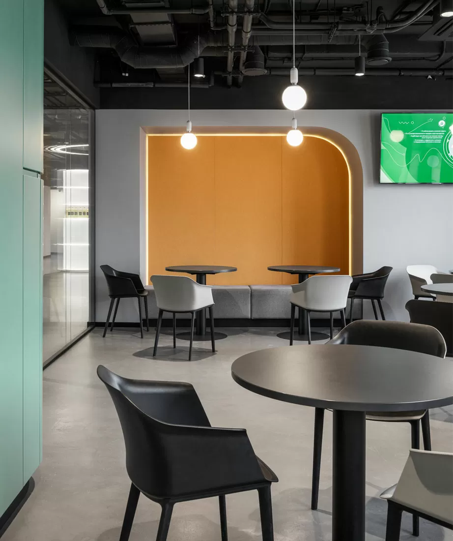 Особенно хочется отметить, как дизайнеры из бюро ОФИСПРОЕКТ справились с вызовом: исходное лофт-пространство с чёрными потолками и бетонными стенами превратили в тёплый, «живой» интерьер. За основу взяли цветовую палитру подсолнуха — от тёмных оттенков семечек до солнечных лепестков. Каждому отделу мы подобрали настольные экраны в уникальном оттенке из общей палитры.