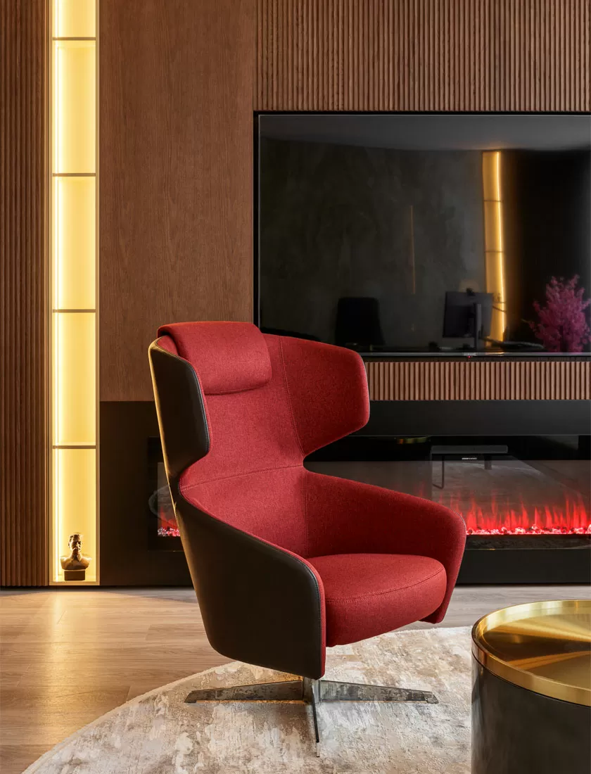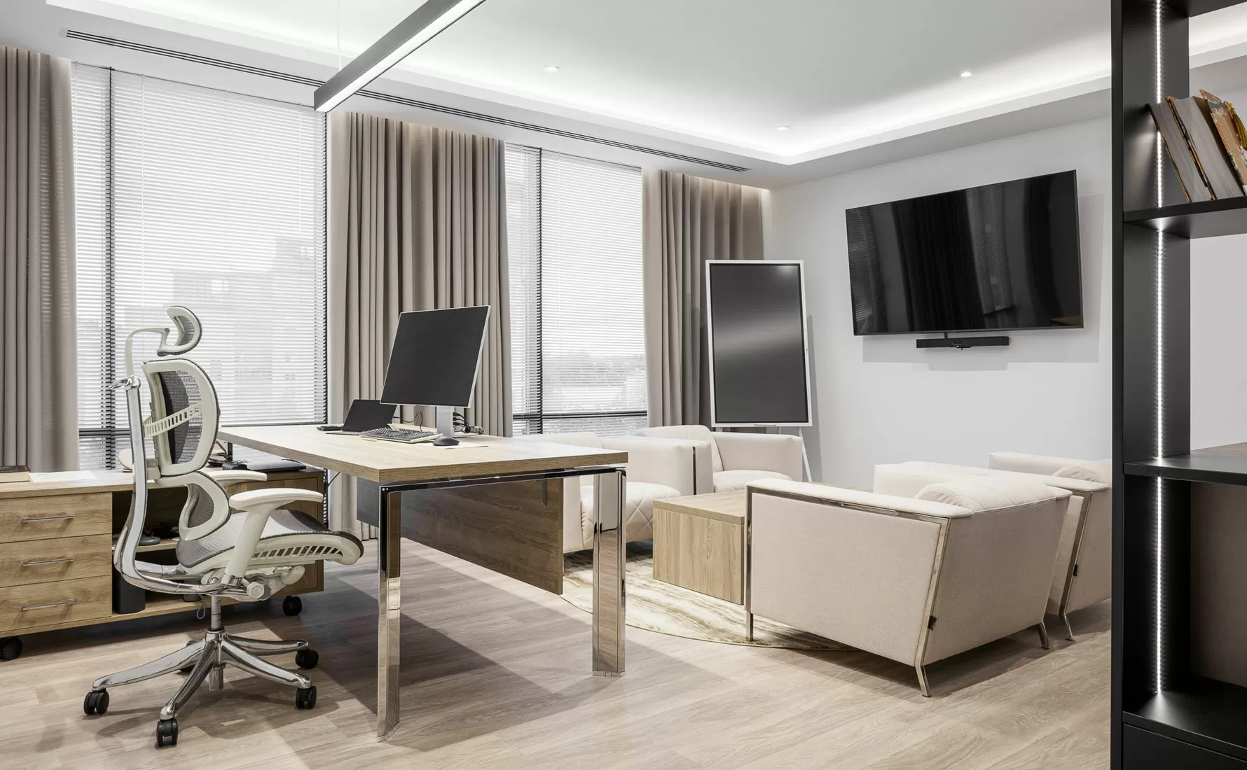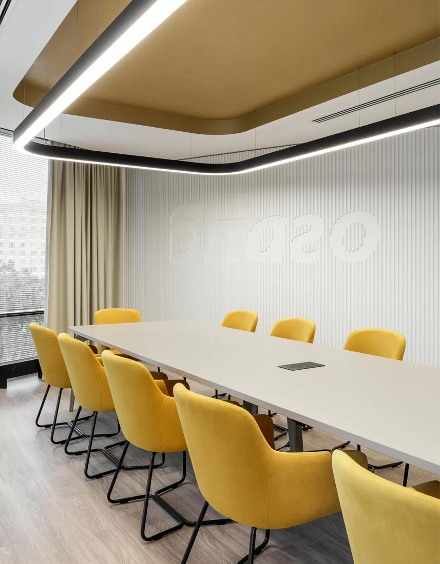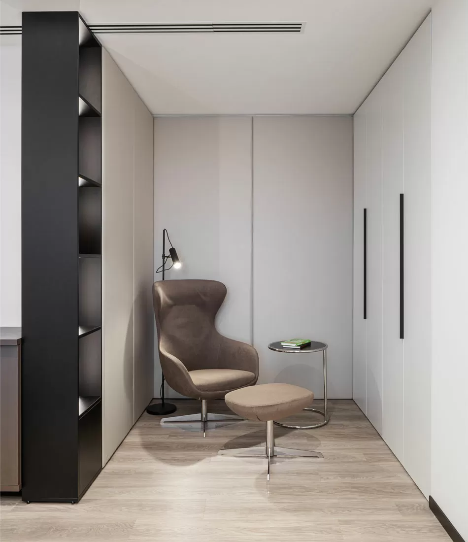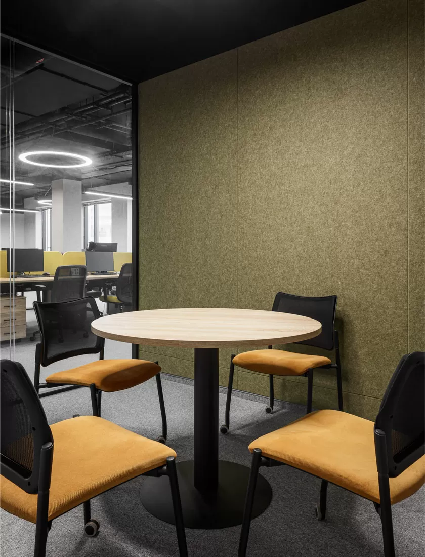 Второй этаж — территория фокуса и концентрации: здесь разместились руководство и ключевые подразделения. В кабинете топ-менеджера гармонично встроена коллекция Fermo, а переговорные — от мини-боксов до больших залов — оснащены столами Flex, креслами Vento High и Corfu с высокими спинками для приватности, мягкими диванами Fiotto и Vita.