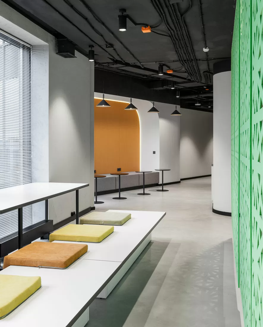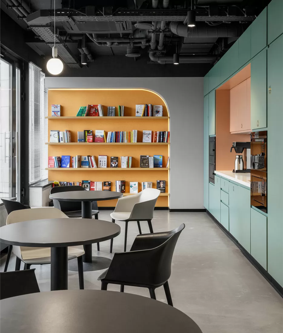 Вся наша мебель подобрана с учётом разных форматов работы: рабочие места оборудованы столами Tour от Involux и креслами Carot, а неформальные уголки дополнены низкими креслами и лавочками. Игровых зон как таковых нет — зато есть домашняя кухня, библиотека с книгами о корпоративных ценностях и мягкий текстиль на окнах.