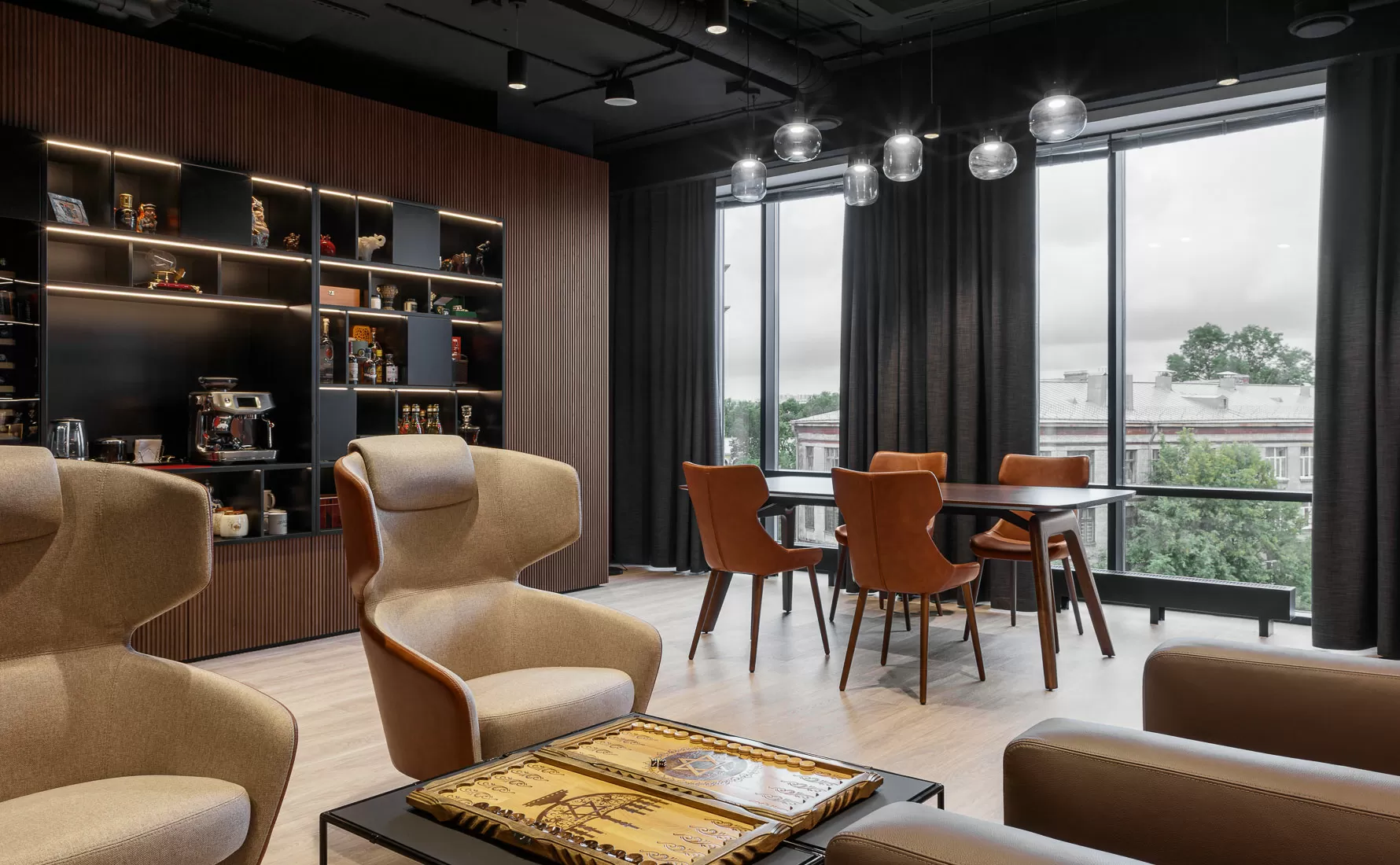 Первый этаж — это лицо компании: тёплая приемная зона, уютные зоны для встреч с партнёрами с мягкими диванами Liro High и креслами Elegance, а ещё многофункциональное пространство на 150 человек. Оно легко превращается из конференц-зала в место для корпоративов, презентаций или просто коворкинга.