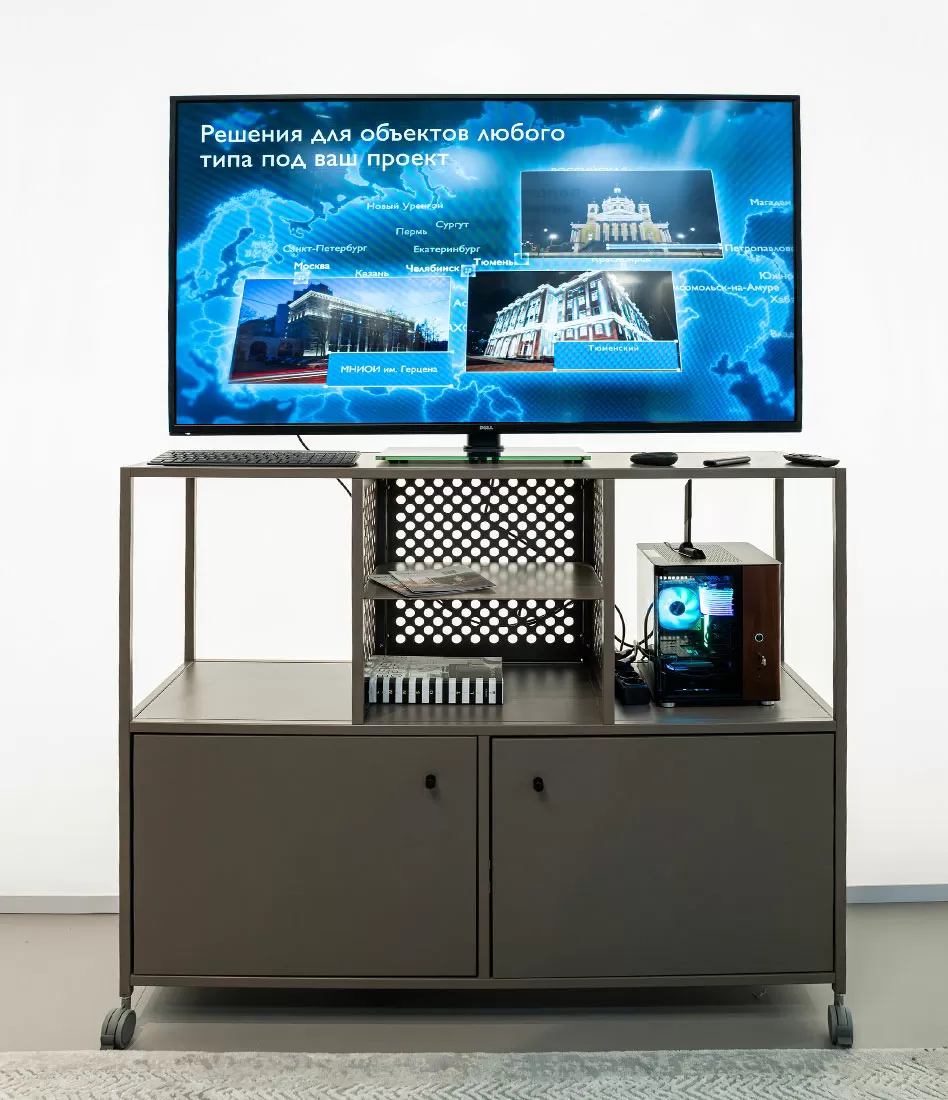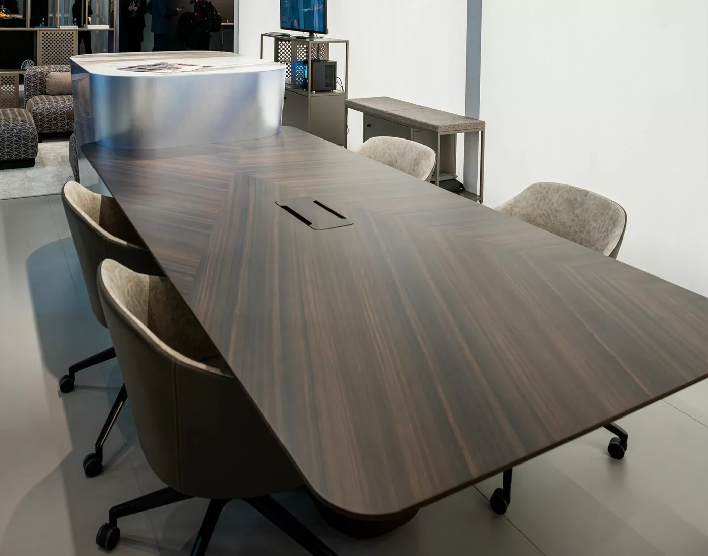 Центром притяжения внимания стал двухуровневый стол индивидуального изготовления. Он выступил визуальной аллюзией на два формата делового общения: строгие переговоры «лицом к лицу» и неформальный диалог у барной стойки, снимающий излишний формализм. В изделии искусно сочетаются шпон, эмаль, металл и камень, демонстрируя возможности кастомизации.