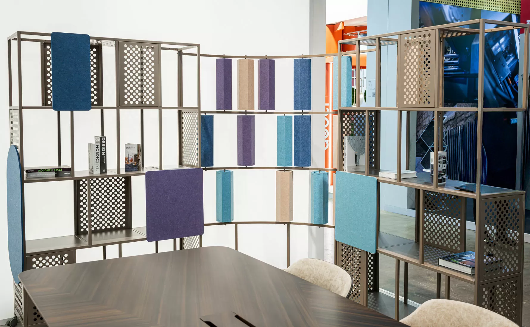 Коллекция предлагает глубокую кастомизацию. Панели могут быть выполнены из шпона, металла или фетра. Если шпон и металл работают на визуальный стиль, то фетровые поверхности берут на себя задачу акустического комфорта, поглощая шум в open-space. Специально к выставке мы представили расширенную версию системы: сервисные тумбы, радиусные элементы и акустические вставки сделали Mindframe еще более функциональной для зонирования.