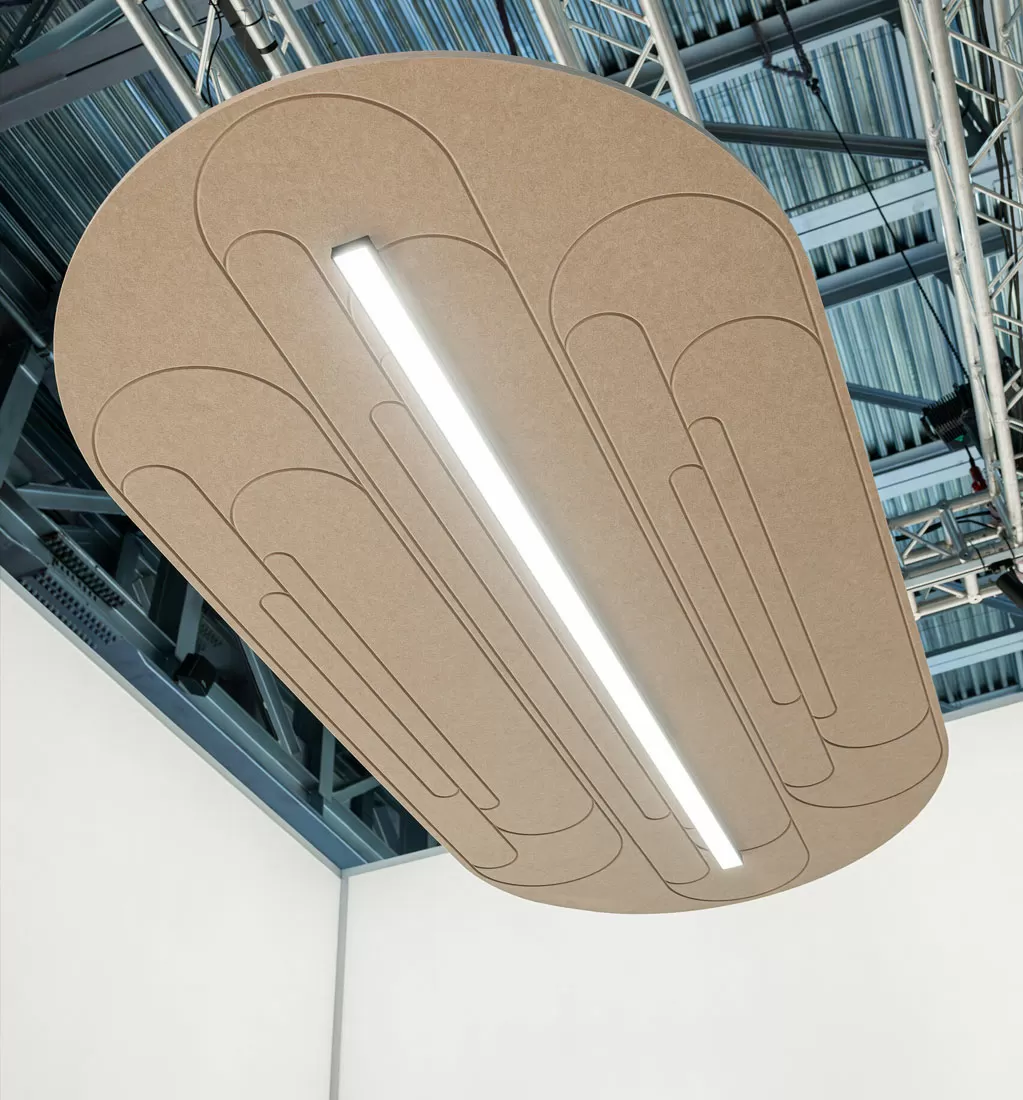 Конструктив светильника интегрирован в акустический фетр, эффективно поглощающий шум и улучшающий звуковой комфорт помещения. Материал доступен в широкой палитре — от приглушённых монохромов до насыщенных акцентов, что позволяет гармонично вписать решение в любой интерьер.